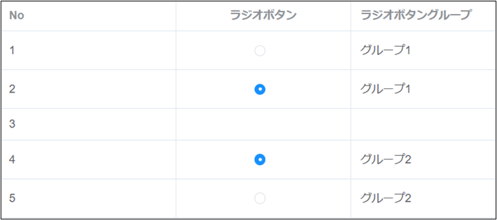 Vue.jsとElement Plusで、ある表(el-tableタグ)のラジオボタン(el-radioタグ)の項目で、複数のグループに分けて表示させるという経験をしたため、その時の実装イメージを簡単な例でご紹介させていただきます。下図が具体例でして、No = 1、2のレコードがあるラジオボタンのグループ、No = 4、5のレコードが別のラジオボタンのグループとなり、複数のラジオボタンのグループが存在します。