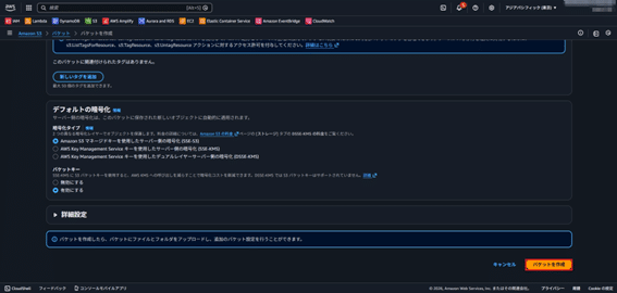 - バケット名を入力し、その他の設定項目は変更せずにそのまま進む。