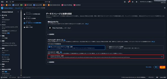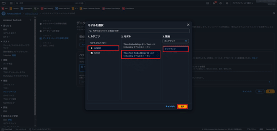 - 埋め込みモデルを選択(Amazon Titan Text Embeddings等)。