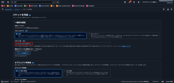 - ベクトルデータベースにあるベクトルデータベースでS3 Vectorsを選択し、次へ。