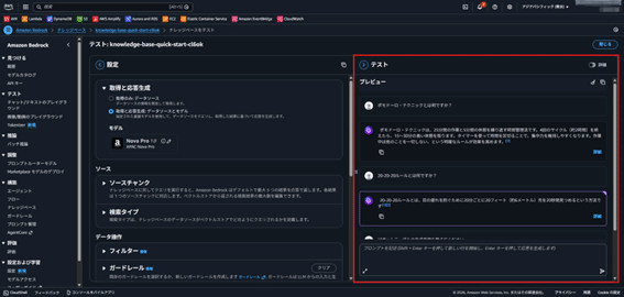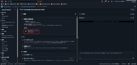 - 「取得と応答生成」にある「取得と応答生成」を選択し、モデルを選択(Amazon Nove Pro 1.0等)。