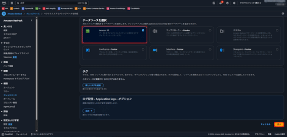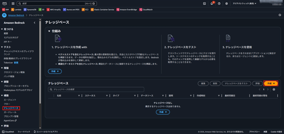 - Bedrockコンソールで「ナレッジベース」→「作成」を選択。