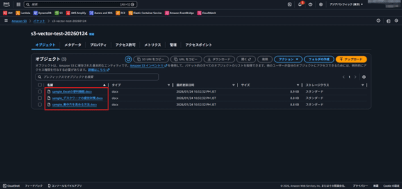 - 作成したバケットを開き、ドキュメントを3点ほどアップロード。